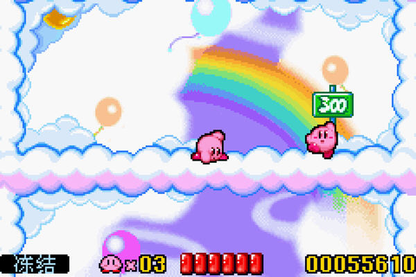A鍵為跳,再按一下就會(huì)含一口氣在肚子里,可以飛起來(lái)。從高處(2/3個(gè)屏幕高)掉下來(lái),就會(huì)大頭朝下落,這樣也是有攻擊力的。在肚子鼓起來(lái)的時(shí)候按B鍵是吐氣,有攻擊力的,攻擊距離很短。在肚子空的時(shí)候按B鍵是吸氣,可以吞掉敵人,就算是有墻隔著的地方也可以吸到。如果是吸到有特殊能力的敵人,按一下十字鍵的下鍵就可以復(fù)制敵人的能力。吸入兩個(gè)敵人再按下鍵,就可以用輪盤選擇能力,等它自動(dòng)停下來(lái)的話,是大錘能力;吸入兩個(gè)敵人后噴出,噴出的星星有穿透效果。(如果將星星和敵人同時(shí)吸入再使用,則使用星星的能力)如果蹲著按B鍵可以做出滑鏟的動(dòng)作。
