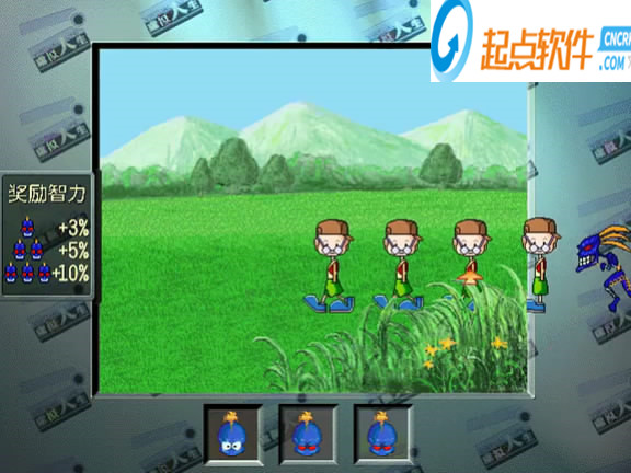 草地上有幾個小朋友玩,其中一個怪物混入,玩家等小朋友排隊后點擊讓他們亂跑,看好怪物變成的人,然后排隊后點擊怪物的位置,連玩家眼力的,增長智力的小游戲。