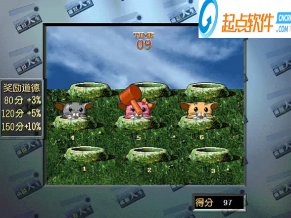 玩家用鼠標點擊地鼠將他打下,綠色地鼠為一分,灰色地鼠為五分但要打三次,粉紅色地鼠不要打否則減3分,獎勵道德值的小游戲。