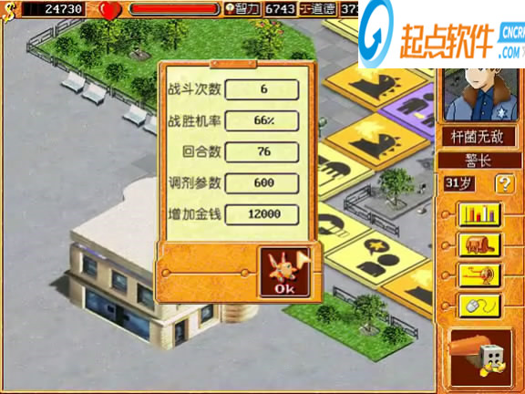 1、金錢數(shù) 2、主角體力 3、四項參數(shù) 4、職業(yè) 5、幫助 6、主角狀態(tài)情況 7、道具 8、地圖 9、系統(tǒng)如存檔、退出游戲等 10、大炮,點擊發(fā)射骰子決定主角步數(shù)。