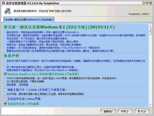 在安裝優(yōu)化前,請退出所有程序,包括殺毒軟件監(jiān)控等,并請先自行安裝好各類驅動。Win8.1系統(tǒng)若不使用metro應用,建議啟用Administrator帳戶登錄使用,軟件兼容性會比較好。啟用方法:右擊以管理員權限執(zhí)行“激活admin用戶(以右鍵管理員權限運行).cmd”,按提示操作。但使用admin帳戶登陸,會導致metro應用不可用,請自己權衡選擇。