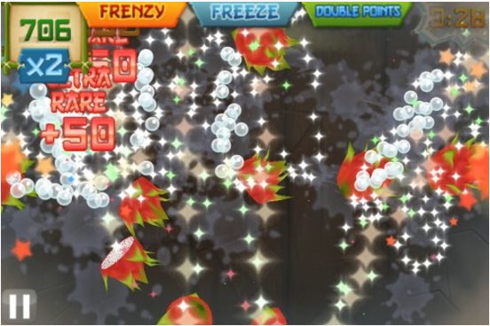 4,靈活掌握三種香蕉的特殊效果,在獲得狂熱效果(Frenzy)后,手指可以從屏幕左右兩端沿水果拋物線滑動,容易出現(xiàn)Combo;在獲得雙倍效果(Double)后,盡量多得到分數(shù);在獲得冰凍效果(Freeze)后,Combo的判定時間大大延長,手指可以慢慢滑動,連續(xù)準確削到多個水果。
