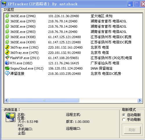 IP追蹤者IPTracke可以快速追蹤流量的去向,刷新分為自動刷新和手動刷新,可根據自己當時需要進行切換,IPTracke會追蹤到IP地區(qū)、運營商及機房。