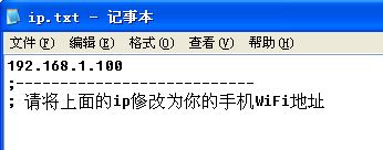 2、將壓縮包全部解壓,編輯“ip.txt”文本文件,將里面的ip地址修改為你的手機WiFi地址;