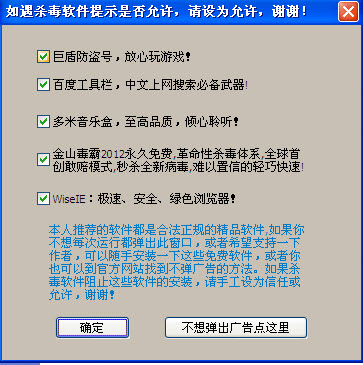 1.42版在用戶點(diǎn)“不想每次彈出廣告窗口”或“關(guān)閉”按鈕后,即使沒(méi)去掉推薦軟件的勾選也不會(huì)自動(dòng)安裝,避免被誤裝軟件。