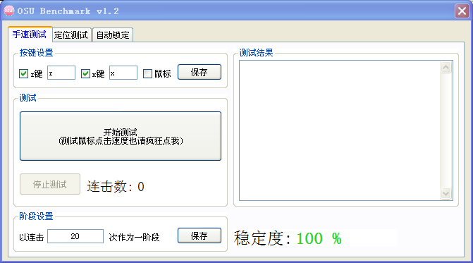 OSU基準(zhǔn)測試工具 OSU Benchmark可以測試手速,也就是不停的點(diǎn)擊鼠標(biāo)的速度,另還有定位測試和自動解定功能,它是一種音樂游戲,需下載音樂地圖就可過癮一把音樂游戲的快感。