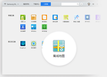 1、用USB數(shù)據(jù)線將手機與電腦連接,打開應用寶點擊工具箱,找到“離線地圖”