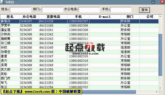 TelQQ V1.1 綠色版 本人認(rèn)為工作中查詢電話號(hào)碼比較麻煩,所以編寫了TelQQ。TelQQ支持姓名、部門、固定電話和手機(jī)的關(guān)鍵字查詢方式。輸入關(guān)鍵字,與關(guān)鍵字相關(guān)的信息自動(dòng)篩選出來。無需回車和點(diǎn)擊鼠標(biāo)其它操作。操作極其簡(jiǎn)單方便。查詢姓名和部門時(shí)支持拼音首字母查詢和漢字查詢。首字母查詢,比如查詢姓名為孫悟空的人員,只需輸入swk;當(dāng)然也可以輸入“孫悟空”進(jìn)行查詢。