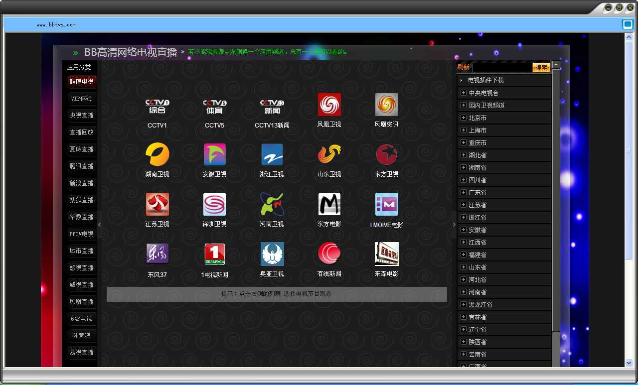 BB高清網(wǎng)絡(luò)電視是一款免費(fèi)、綠色免安裝的高清網(wǎng)絡(luò)電視播放器軟件,目前正式版本是3.0,軟件只有1.16M大小。