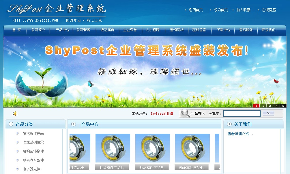 ShyPost企業(yè)管理系統(tǒng)擁有十幾種模板,可供用戶自由選擇,適合各行各業(yè)使用,各模板均精心開發(fā)、界面美觀時尚、動感十足!如流行的藍(lán)色基調(diào)彰顯科技以人為本的宗旨,時刻給人以無限的美感!軟件具有強(qiáng)大的前臺展示和后臺管理兩部分組成。