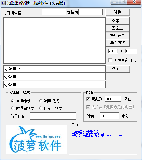 菠蘿泡泡堂喊話器是專門為泡泡堂游戲玩家在游戲內(nèi)便于喊話的輔助工具,全后臺性便于操作。目前有三點(diǎn)功能,泡泡堂游戲內(nèi)刷動態(tài)房間名、泡泡堂大廳正常喊話、刷喇叭以及喇叭圖案 。