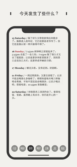 一目了然的界面,簡(jiǎn)便直觀的用法。為您帶來(lái)超乎一般日記應(yīng)用的使用體驗(yàn)。