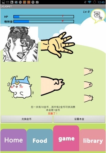 JOJO手機(jī)寵物 JOJOPET是一款養(yǎng)成游戲。以熱門漫畫JOJO為題材制作的同人游戲,玩家可以隨便飼養(yǎng)寵物,給它投食,一起玩小游戲,讓寵物升級并解鎖更多的寵物??傊甁OJO粉一定要來玩一下啦。感謝jojo-pet-ahu項(xiàng)目組。