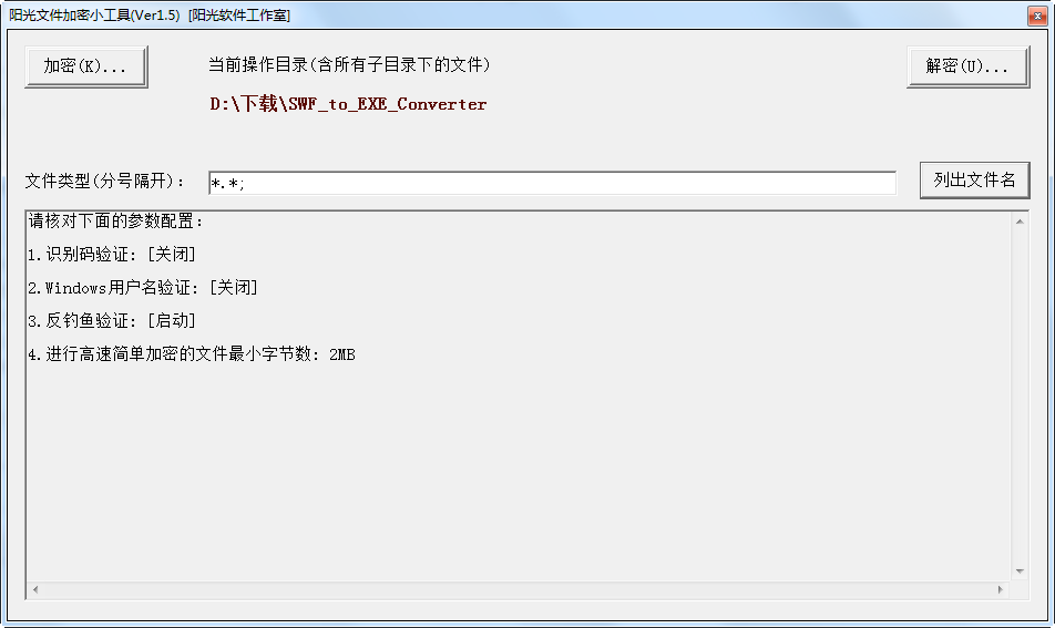 陽光文件加密工具可以加密指定文件夾下的重要文件,加密后,即便硬盤或U盤被盜去,文件的內(nèi)容也不會泄密。解密后即可正常操作文件,加密一次后,以后的加密都是一鍵完成,操作便捷。因?yàn)檐浖O(shè)計(jì)者本人也無法解密,所以用戶切記要抄記好密碼,并多做加密后的文件備份。本軟件絕無后門,請大家放心使用。軟件設(shè)計(jì)者本人也是用此軟件保護(hù)源代碼和WORD文檔,用文件時(shí)先斷網(wǎng)后再解密,用完文件后再一鍵加密。因軟件設(shè)計(jì)者水平有限,難免紕漏,故特此作免責(zé)申明。請用戶務(wù)必仔細(xì)閱讀好使用說明書。