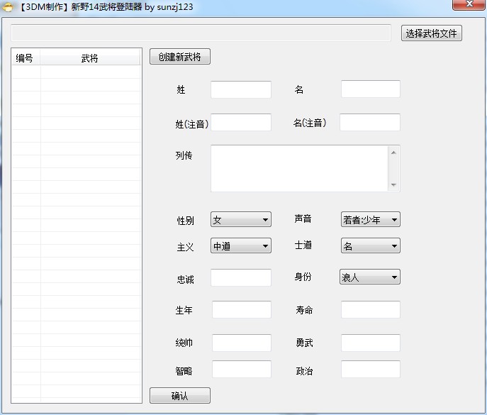 3.新建武將:點(diǎn)擊新建按鈕,填寫武將信息,點(diǎn)擊確定按鈕,創(chuàng)建成功