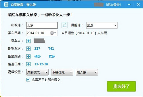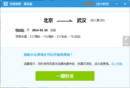 百度衛(wèi)士搶票版是最快的搶票神器,用戶只需設(shè)定好火車票的相應(yīng)信息,百度衛(wèi)士就會在瞬間檢測出是否有符合條件的車票,自動進行反復(fù)搶票,甚至連以往用戶必須手動填寫的驗證碼也由機器智能輸入。系統(tǒng)搶票成功后,會直接引領(lǐng)用戶進入12306支付頁面,無需二次登陸,快速完成付款流程。由于百度衛(wèi)士搶票版采用極速加載技術(shù),精簡了大量用戶正常訪問12306時加載的不必要的網(wǎng)頁元素,真正從內(nèi)核上優(yōu)化網(wǎng)絡(luò)訪問速度,使搶票時間遠遠低于瀏覽器和插件類產(chǎn)品,大大地提高了訂票的成功率。