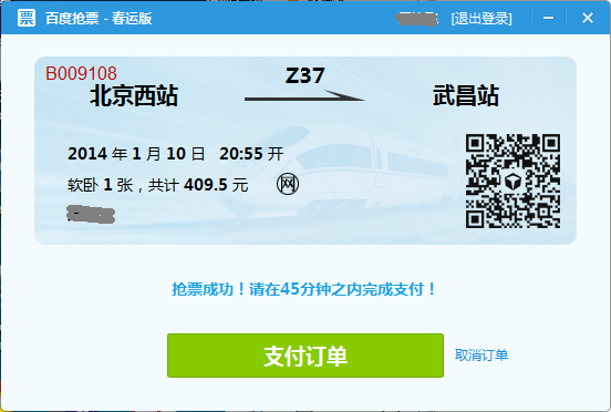 3、搶票成功支付訂單就可以完成搶票啦。 然后去火車站自動取票窗口取票即可