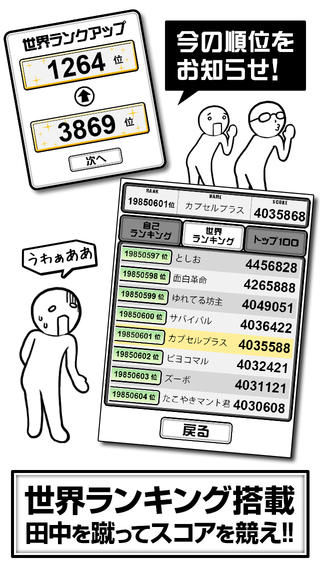 爆踢田中桑游戲的玩法很簡(jiǎn)單,游玩的界面站著一排撅著屁股背對(duì)著你的人,依次看過(guò)去,是田中桑的話,就點(diǎn)擊“踢他”(ける!)按鈕,不是田中的話就選擇“不踢”(けらない)按鈕。游戲有時(shí)間限制,考驗(yàn)的就是看誰(shuí)能在最短時(shí)間內(nèi)踢到最多的“田中”。
