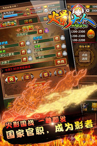 《火影大人》是一款以著名動(dòng)漫《火影忍者》為故事背景的手機(jī)卡牌策略游戲,游戲中引入多種忍者角色,并在玩法上進(jìn)行了重大創(chuàng)新,游戲中不僅有歷練升級(jí)、闖關(guān)奪寶、競(jìng)技挑戰(zhàn)等常規(guī)玩法,更是首創(chuàng)獨(dú)具特色的國(guó)戰(zhàn)系統(tǒng)。玩家在進(jìn)入游戲之初便要選擇火、水、雷、風(fēng)、土任一國(guó)家,每晚19:30全服開(kāi)啟國(guó)戰(zhàn),各國(guó)精英齊聚一堂抗擊敵人,體會(huì)萬(wàn)人國(guó)戰(zhàn)千人斬的爽快感覺(jué)!每場(chǎng)國(guó)戰(zhàn)力挽狂瀾的英雄將受萬(wàn)眾敬仰,圓玩家英雄夢(mèng)想!每位志存高遠(yuǎn)的玩家也可以通過(guò)實(shí)力競(jìng)爭(zhēng)國(guó)家官員乃至影者(國(guó)王),走向至尊!【更新日志】