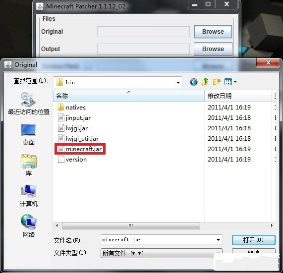 b.選擇你游戲目錄bin文件夾下的minecraft.jar