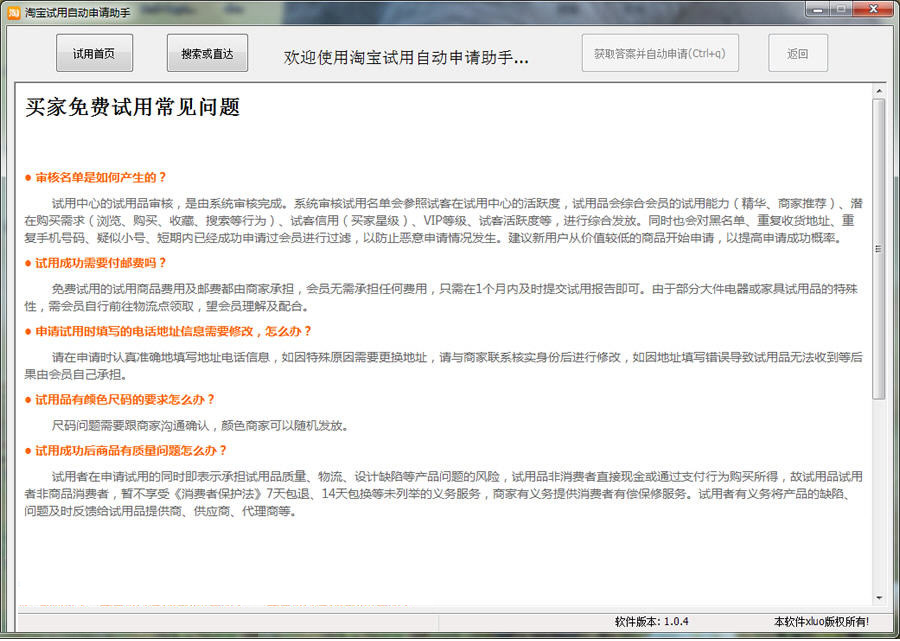 淘寶試用中心自動(dòng)申請助手是一款專為淘寶迷們提供的試用品自動(dòng)申請軟件,淘寶試用助手可以在"免費(fèi)試用" 一類中自動(dòng)完成物品申請?zhí)峤徊僮?,幫助用戶釋放雙手,增加物品申請成功幾率。
