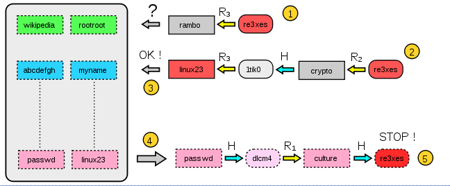 H(wikiedia)=ao4kd -> R1(ao4kd)=secret -> H(secret)=9kpmw -> R2(9kpmw)=jimbo -> H(jimbo)=v0d$x -> R3(v0d$x)=rootroot H(abcdefgh)=1vn6s-> R1(1vn6s)=bernie-> H(bernie)=kolscx-> R2(kolscx)=zurich-> H(zurich)=8ntpy -> R3(8ntpy)=myname .... H(passwd)=dlcm4-> R1(dlcm4)=culture-> H(culture)=re3xes-> R2(re3xes)=crypto-> H(crypto)=1tik0-> R3(1tik0)=linux23