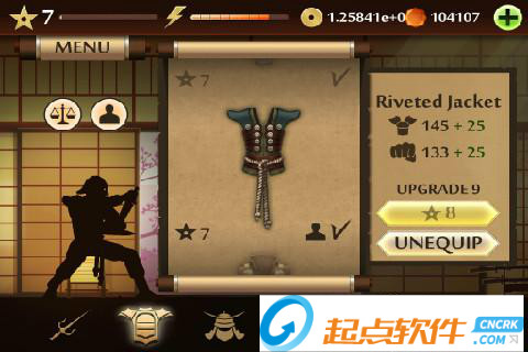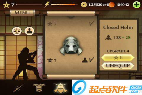 2、MENU菜單:點擊左上角的MENU,可以展開面板,第一個圖標是進入訓練室,在里面可以進行招式的演練;第二個是挑戰(zhàn)模式,進入之后可以選擇相應的“關卡”來和各個忍者進行戰(zhàn)斗;第三個是武器庫,可以用金幣或者鉆石來購買武器、護甲和頭盔;最后一個圖標的功能還沒有上線~