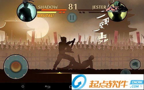 1、游戲操作:屏幕左側的虛擬搖桿控制角色的移動和站位。左右方向是移動鍵,上鍵則是跳躍,按下鍵可以蹲下。右邊的2個按鈕也很明顯,一個拳頭表示用手攻擊,腳的圖標則可以用腳踢。
