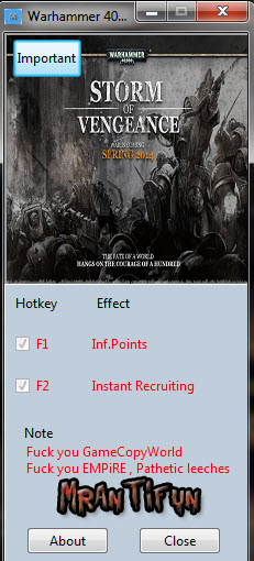戰(zhàn)錘40K復(fù)仇風(fēng)暴修改器是為科幻戰(zhàn)棋游戲戰(zhàn)錘40K復(fù)仇風(fēng)暴提供的輔助工具,能夠帶給玩家無(wú)限點(diǎn)數(shù)和瞬間招募功能,可以幫助玩家在游戲中玩的更加暢快。