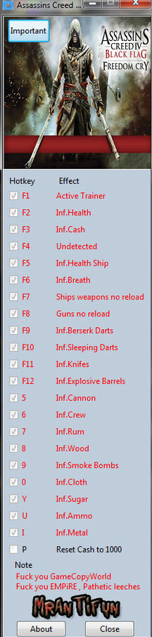 刺客信條4自由吶喊修改器是一款同名游戲的強大作弊器,是玩家玩這款刺客信條4自由吶喊游戲不可缺少的游戲輔助工具哦,一共添加21項修改功能,需要修改的地方都給修改了,降低了游戲的難度,讓你更好的體驗游戲。