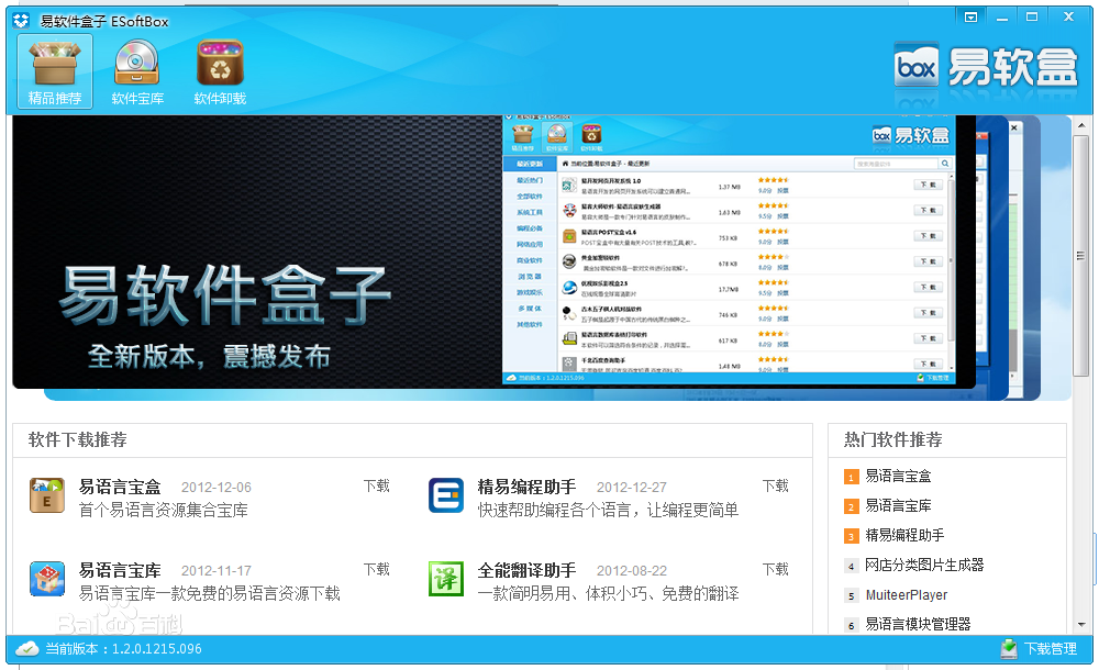 1.易軟件盒子(簡(jiǎn)稱:易軟盒)是由精易論壇開(kāi)發(fā)的一個(gè)提供一些關(guān)于E語(yǔ)言制作的軟件下載、更新、優(yōu)化功能