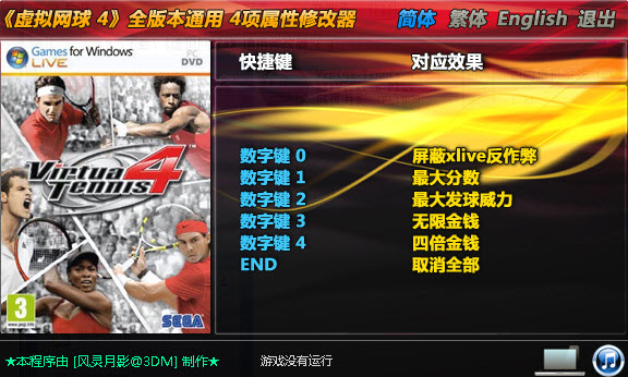 虛擬網(wǎng)球4修改器是為同名網(wǎng)球競(jìng)技游戲提供的輔助作弊工具,可以為玩家?guī)?lái)無(wú)限分?jǐn)?shù)、金錢等多種功能,幫助玩家在游戲中有更好的發(fā)揮。