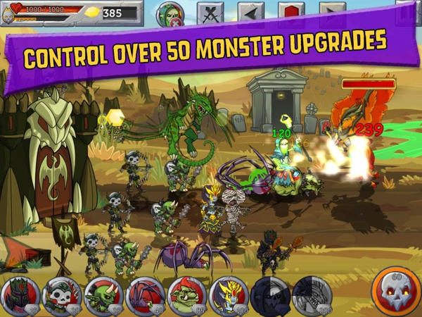 怪獸之戰(zhàn)是Legendary Wars的后續(xù)作品。英雄和怪物都有一個(gè)屬于他們自己的傳說,今天的故事屬于怪物。他們一直在尋找對方的弱點(diǎn),現(xiàn)在是時(shí)候報(bào)復(fù)了,指揮超過50中的怪物,用一個(gè)經(jīng)典的防御,打敗英雄。屬于怪物的復(fù)仇開始。Monster Wars沿用了《Legendary Wars》中很多的素材,包括角色、設(shè)定、界面等等,都基本如出一轍,唯一不同的僅僅是此次玩家所要操控的角色是怪獸,進(jìn)攻的對象則是正義戰(zhàn)士,兩款游戲互換了角色立場。該游戲一共有7個(gè)場景,約60個(gè)關(guān)卡,游戲地圖龐大,玩家可通過右下角的按鈕來進(jìn)行地圖的縮放。本作有無盡模式,完成故事模式后便可解鎖。游戲的玩法很簡單,主要有兩種形式,一種是全觸屏控制,玩家通過生產(chǎn)、出兵、攻擊等操作,消滅敵軍,或摧毀敵軍城堡,怪獸軍隊(duì)的出動或部署完全由玩家依據(jù)敵軍的規(guī)模有針對性的自由操作,雙方作戰(zhàn)單位靠近時(shí),會自動進(jìn)行普通的攻擊,當(dāng)然玩家也可以通過右下角的按鈕進(jìn)行技能操作,技能需要消耗技能值,技能值可以通過擊殺敵軍獲取,關(guān)卡勝利后可以獲得金幣的獎(jiǎng)勵(lì)。