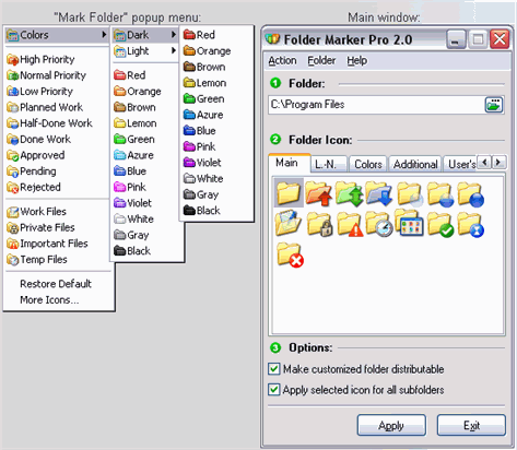 Folder Marker 是一款允許你快速地改變文件夾圖標(biāo)以標(biāo)示優(yōu)先級(jí)別或者項(xiàng)目狀況(高,低,完成,完成一半,已被計(jì)劃等等)的外殼擴(kuò)展軟件,或者你可以使用該軟件使用你所選擇的特殊圖標(biāo)或者顏色標(biāo)記一個(gè)文件夾。