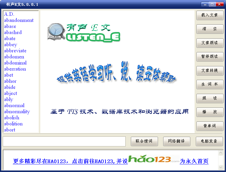 有聲E文是一款功能強(qiáng)大的英語學(xué)習(xí)軟件。通過驅(qū)動文本語言轉(zhuǎn)換、數(shù)據(jù)庫技術(shù)和web瀏覽器應(yīng)用三項(xiàng)技術(shù)合一制作出有聲英文音頻。主要功能有文章朗讀、暫停與繼續(xù)、清空、文章轉(zhuǎn)換、添詞、糾錯(cuò)、跟讀與播放、背單詞、網(wǎng)絡(luò)檢索、電腦發(fā)音和聯(lián)合搜詞。適合各類學(xué)英語人群適用。
