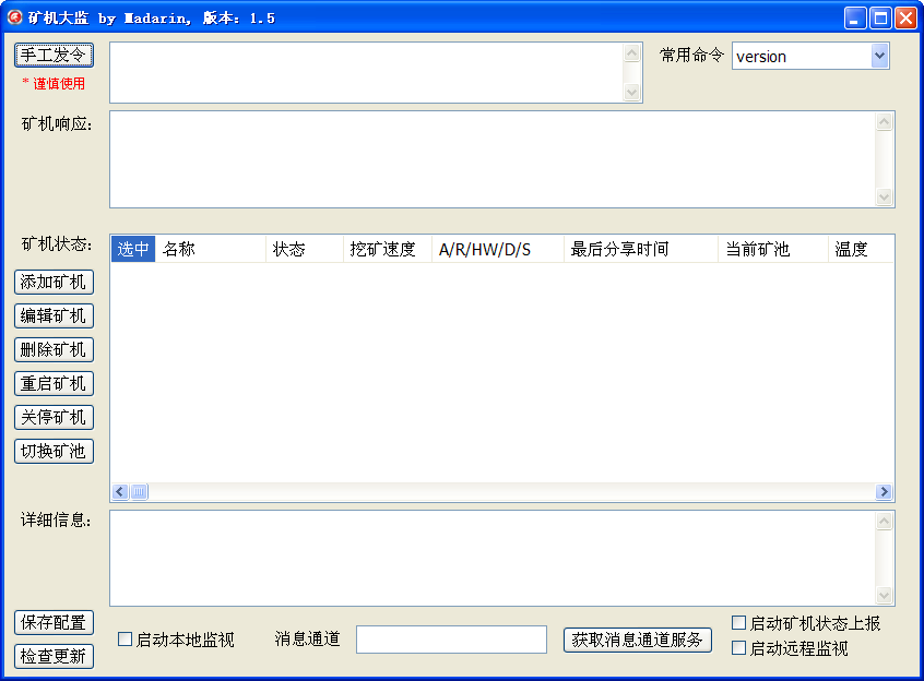 礦機(jī)大監(jiān)是用來監(jiān)控觀察礦機(jī)狀況的一款軟件??梢酝ㄟ^外網(wǎng)或者局域網(wǎng)來款看礦機(jī)的一個(gè)時(shí)時(shí)狀態(tài),并且支持遠(yuǎn)程重啟、關(guān)閉、換框池操作。有需要的快來下載吧。