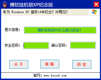 博軟掛機(jī)鎖XP紀(jì)念版是專為即將停止更新服務(wù)的XP忠實(shí)用戶提供的電腦掛機(jī)鎖,掛機(jī)鎖官方免費(fèi)下載可以幫助用戶在離開(kāi)電腦的時(shí)候自動(dòng)鎖定屏幕,還可以設(shè)置注銷、鎖定計(jì)算機(jī)操作是否執(zhí)行,非常適合家庭、學(xué)校等使用。