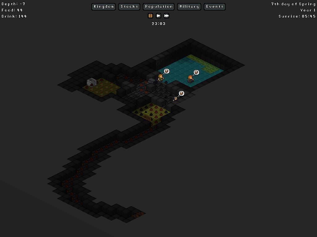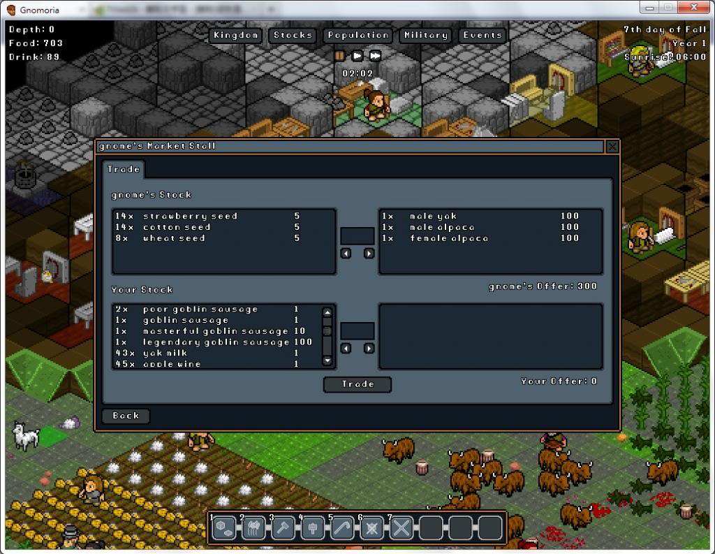關(guān)于交易,泥土和原石價值是0,能扔就扔了,節(jié)省一些存儲空間。賣出一些沒太大用處的資源,然后買進(jìn)一些當(dāng)前急需的,以及牛羊畜生。商人擺攤工作坊,提示沒有商人最后,要時刻注意右上角提示信息。尤其是食物,飲品不足矮人們可以去水井喝水,但食物不足只能活活餓死了……