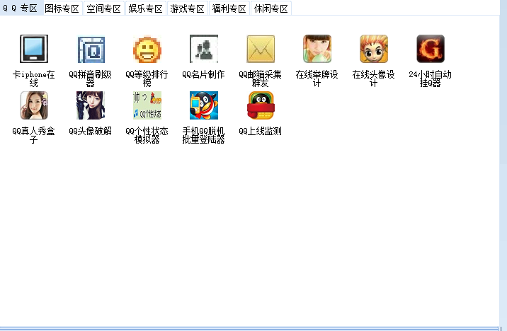 QQ專區(qū):卡iPhone在線、QQ拼音刷機(jī)、QQ等級排行、QQ名片制作、QQ郵箱采集、在線舉牌設(shè)計(jì)、在線頭像設(shè)計(jì)、24小時(shí)自動掛Q器、QQ真人秀盒子、QQ頭像破解、QQ個(gè)性狀態(tài)模擬器、手機(jī)QQ脫機(jī)批量登錄器、QQ上線檢測圖標(biāo)專區(qū):QQ旋風(fēng)秒點(diǎn)、QQ堂秒點(diǎn)