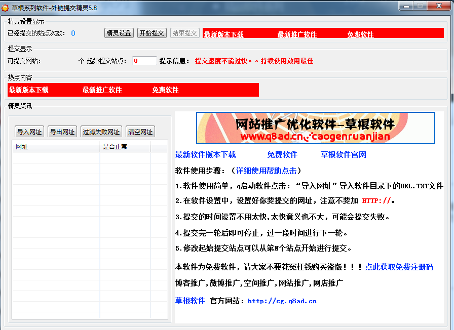 1.軟件使用簡單,q啟動軟件點(diǎn)擊:“導(dǎo)入網(wǎng)址”導(dǎo)入軟件目錄下的URL.TXT文件。2.在軟件設(shè)置中,設(shè)置好你要提交的網(wǎng)址,注意不要加 HTTP://。