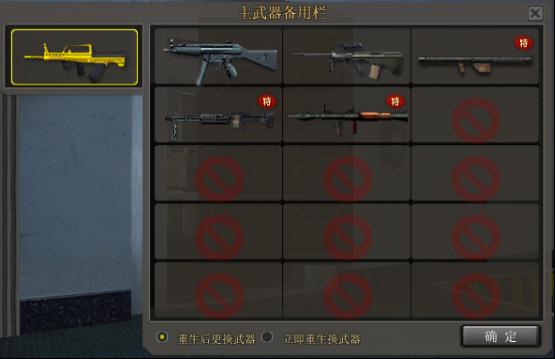 切換武器:在游戲的任何時間內(nèi),默認按“N”鍵都可以打開您的主武器備用欄,如下圖。您用鼠標左鍵選擇一把武器之后,選擇“重生后更換武器”點擊確定按鈕,則會在下次復生后切出選擇的武器。如果選擇“立即重生換武器”后點擊確定,則立即犧牲,復生后切出之前選擇的武器。