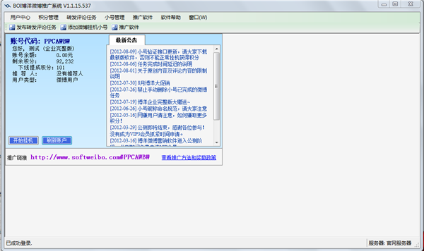 博洋微博營銷管理工具是適用于新浪微博、騰訊微博的一款輔助工具。軟件頁面簡潔、功能強(qiáng)大。它支持微博關(guān)鍵詞搜索營銷、客戶關(guān)系管理、微博用戶追蹤、官方微博管理等等。使用博洋全自動(dòng)新浪騰訊微博轉(zhuǎn)發(fā)評論軟件輕松幫你打造人氣微博。