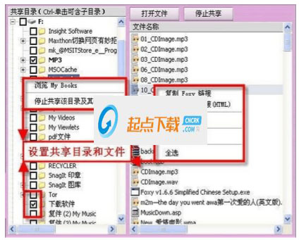 第四分鐘 共享資源?!叭巳藶槲遥覟槿巳恕?,把自已的資源貢獻(xiàn)出來,才能得到更的回報。點擊主界面中的“共享”按鈕,在“共享目錄”欄中勾選共享的文件夾,重新啟動Foxy后就可以在“文件名稱”欄中看到共享目錄中的文件了。如果不想把文件夾里的所有文件都共享出來,可以右擊不想共享的文件,選擇“停止共享”即可將它從共享文件列表中取消(如圖5)。不過取消某個文件的共享是暫時的,下次啟動Foxy時這個文件仍然會被共享出來。