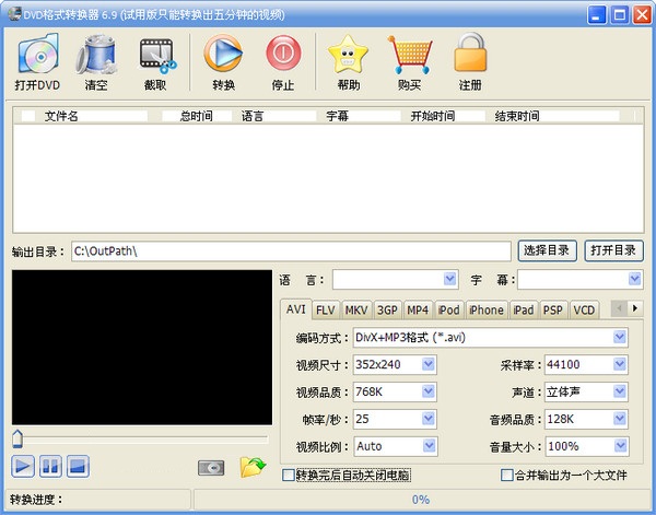 人性化軟件界面,操作簡(jiǎn)單,兼容DVD光盤能力強(qiáng),處理速度快,輸出文件清晰度高,可以任意設(shè)置輸出文件的參數(shù),如視頻尺寸,視頻比特率,音頻采樣率等,來(lái)調(diào)整輸出文件大小和清晰度。您可以在DVD格式轉(zhuǎn)換器選擇DVD光盤中的各種字幕、語(yǔ)言等信息與DVD中的視頻一起完整地轉(zhuǎn)換輸出其他流行格式,可以設(shè)置時(shí)間來(lái)截取片段輸出,也可以把多個(gè)標(biāo)題合并輸出一個(gè)文件,并且可以在播放預(yù)覽DVD視頻時(shí),來(lái)拍照抓取精彩圖片。