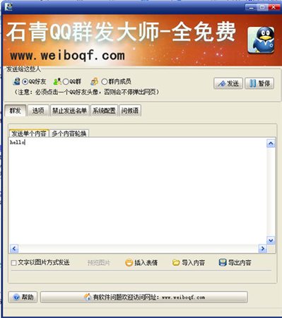 石青QQ群發(fā)大師是一款全自動(dòng)QQ群發(fā)軟件。軟件獨(dú)創(chuàng)的所見(jiàn)所得的發(fā)送模式,發(fā)布消息方便快捷。石青QQ群發(fā)大師還支持QQ和QQ群、群成員發(fā)送,可以永久免費(fèi)使用。