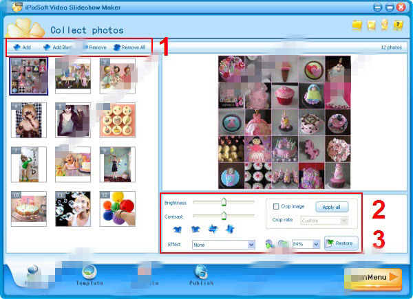 在一張幻燈片中添加最多500張圖像;修改亮度,對(duì)比度,公司等照片;對(duì)照片應(yīng)用各種過(guò)濾效果;添加wav,mp3,wma格式的音頻作為背景音樂(lè)。