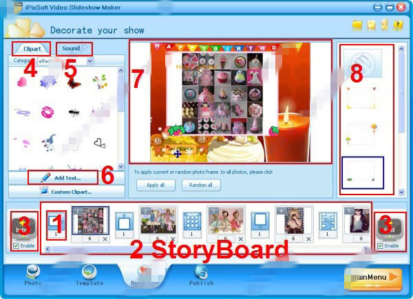裝飾與150+高品質(zhì)動(dòng)畫剪貼畫;從100多個(gè)聲音中挑選,使您的幻燈片更有趣;添加您自己的swf,jpg,bmp,png格式文件來(lái)裝飾幻燈片。