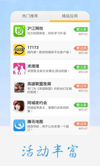 1、賺錢首選:利用51淘金,可以在手機上邊玩應(yīng)用邊賺錢2、任務(wù)多樣:安裝應(yīng)用、游戲體驗、簽到注冊、轉(zhuǎn)發(fā)分享等3、安全可靠:推薦的應(yīng)用經(jīng)過檢測篩選,可以放心使用