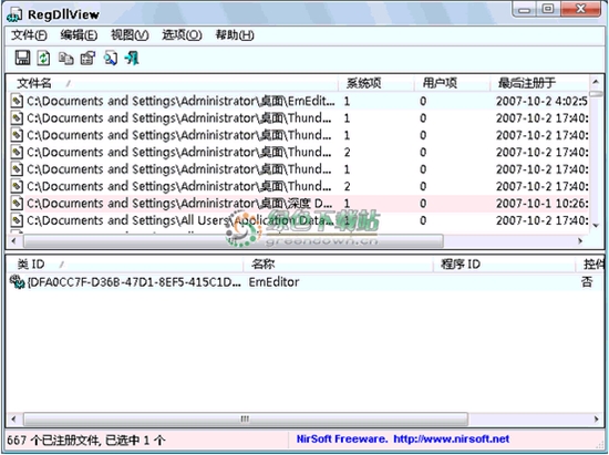 RegDllView 可以顯示出你的電腦里所有已注冊(cè)的dll, ocx, exe組件(COM 注冊(cè)),在每個(gè)已注冊(cè)的文件中,你可以查看它的最后注冊(cè)日期,CLSID和ProgID等.還可以以粉紅色來顯示已注冊(cè)但丟失的源文件,可以點(diǎn)右鍵來注冊(cè)和反注冊(cè)模塊. 特別是在安裝某程序后沒有卸載干凈的注冊(cè)模塊,可以很方便地清理注冊(cè)表垃圾無用的CLSID組件垃圾.RegDllView 是獨(dú)立的程序,不需要安裝,你可以在任意文件夾里運(yùn)行它