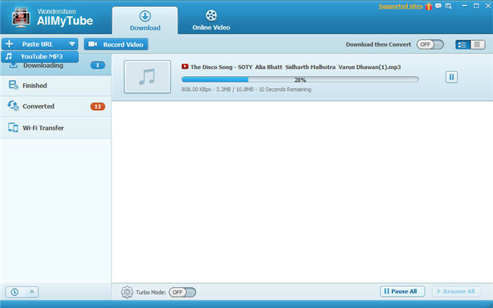 2).你 YouTube 視頻的 URL 下載音頻通過復制/粘貼: 復制 YouTube 視頻的 URL 并單擊"YouTube MP3"按鈕從下拉"+ 粘貼 URL"下載菜單。